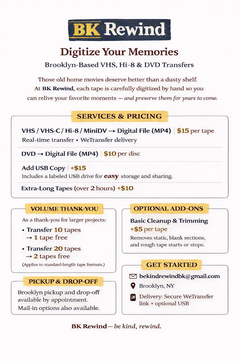 Born and based in Brooklyn, we understand that your tapes are more than magnetic ribbon; they're your personal history. In a world of fast-digitization, we choose the careful, hands-on approach.